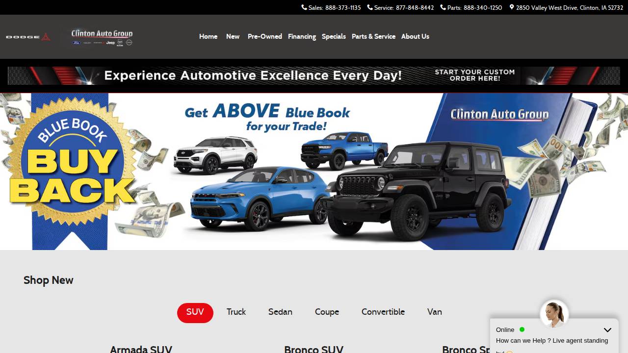 Visit Clinton Auto Group in Davenport IA to buy a new or used Ford, Nissan, Dodge, Jeep, RAM or Chrysler. We serve drivers near Davenport, Bettendorf, Moline and East Moline IL. Call Clinton to test drive a car, truck, van or SUV today!